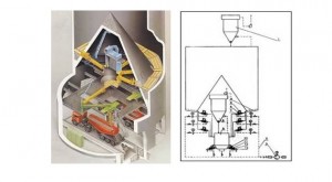 IBAU庫(kù)采用德國(guó)漢堡公司的連續(xù)均化技術(shù)。在外部帶一攪拌倉(cāng),庫(kù)底中心設(shè)一大圓錐,庫(kù)內(nèi)生料的重量通過(guò)該錐傳遞給庫(kù)壁,庫(kù)底環(huán)形空間被分成向中心傾斜10度的6個(gè)充氣區(qū),每區(qū)裝設(shè)3種規(guī)格的6個(gè)充氣箱。充氣卸料時(shí)生料先被送至一條徑向布置的充氣箱上,再經(jīng)過(guò)錐體下部的出料口由空氣斜槽送入庫(kù)底中央4000mm計(jì)量倉(cāng)中。卸料時(shí),生料在自上而下的流動(dòng)過(guò)程中,切割水平料層而產(chǎn)生重力混合 作用,進(jìn)入攪拌倉(cāng)后又連續(xù)充氣攪拌而得到進(jìn)一步均化,均化效果H可達(dá)6~8,電耗0.1~0.2Kwh/t生料。