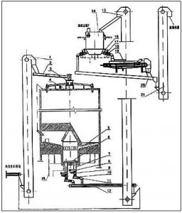 MF生料均化庫的生料采用分配器和六根斜槽呈輻射狀卸入庫內(nèi),基本形成水平料層,庫底是錐形,略向中心傾斜,中部有一中心混合室,中心室與庫壁之間的均化庫庫底分為6-14個(gè)充氣區(qū),每區(qū)設(shè)3條充氣斜槽和3個(gè)卸料孔,卸料時(shí)向兩相對區(qū)輪流充氣,在卸料中上方出現(xiàn)多股漏斗凹陷,漏斗沿直徑排成一列,隨充氣的交換而旋轉(zhuǎn)角度,這樣不但產(chǎn)生重力混合,而且生料從庫底卸入中心室后,中心室底部連續(xù)充氣,使生料又獲一次均化,由于這種庫的均化原理是以料流重力混合為主要手段,所以電耗極省,能耗僅為0.432~0.576Mj/t,均化值H可達(dá)7-10,該系統(tǒng)具有高效節(jié)能,基建投資低和操作管理簡便等優(yōu)點(diǎn)。